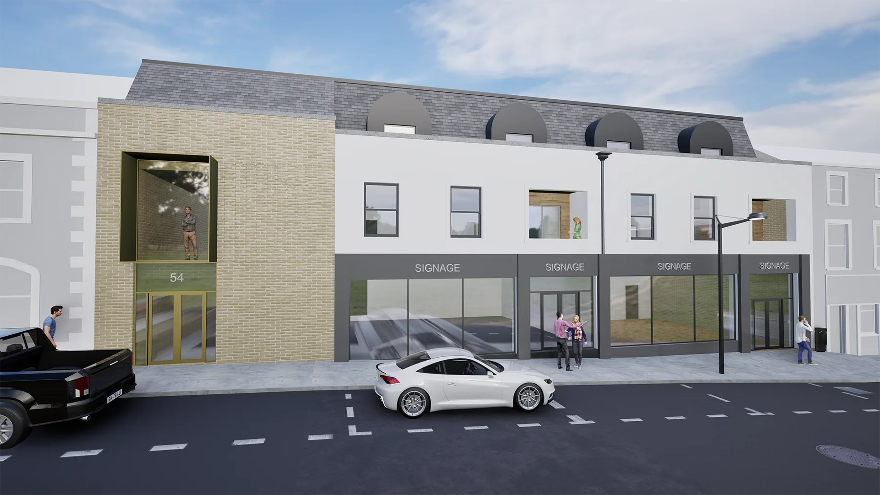 The architectural strategy responds directly to its dual context. Along the main street, the building reinforces the existing urban grain through a strong street edge, vertical rhythm and a robust material palette. Retail units at ground floor provide active frontage and visual engagement at street level, contributing to the vitality and commercial life of the town centre.