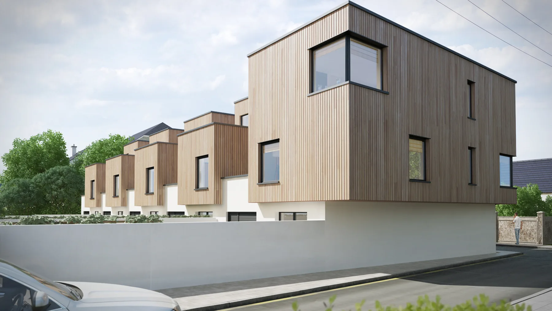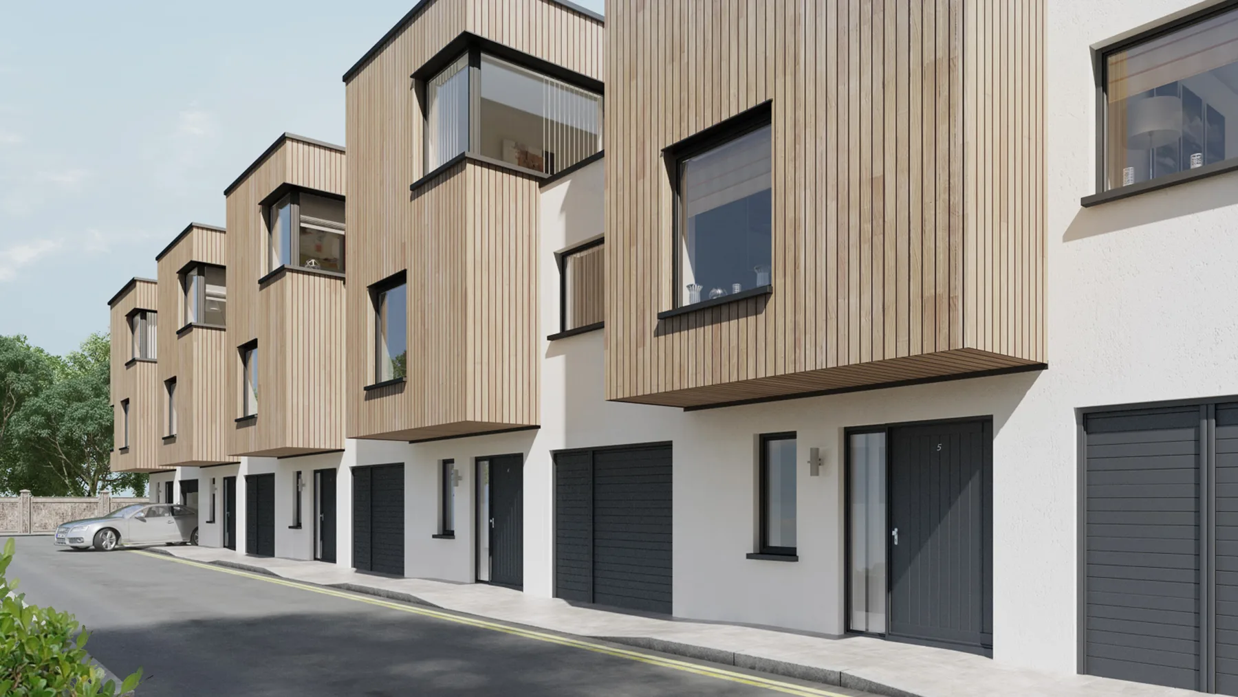 The development consists of five terraced houses accessed via the right of way. In order to maintain a vertical emphasis to the design timber boxes were introduced and the third floor “indented.” The timber boxes project out over the entrances to emphasise their location and to provide shelter. This over-sailing is repeated to the rear to allow the timber boxes to read as separate components within the overall design.