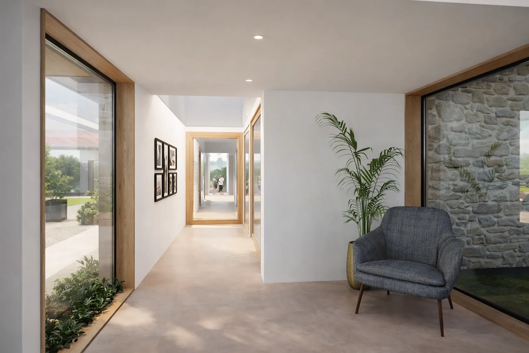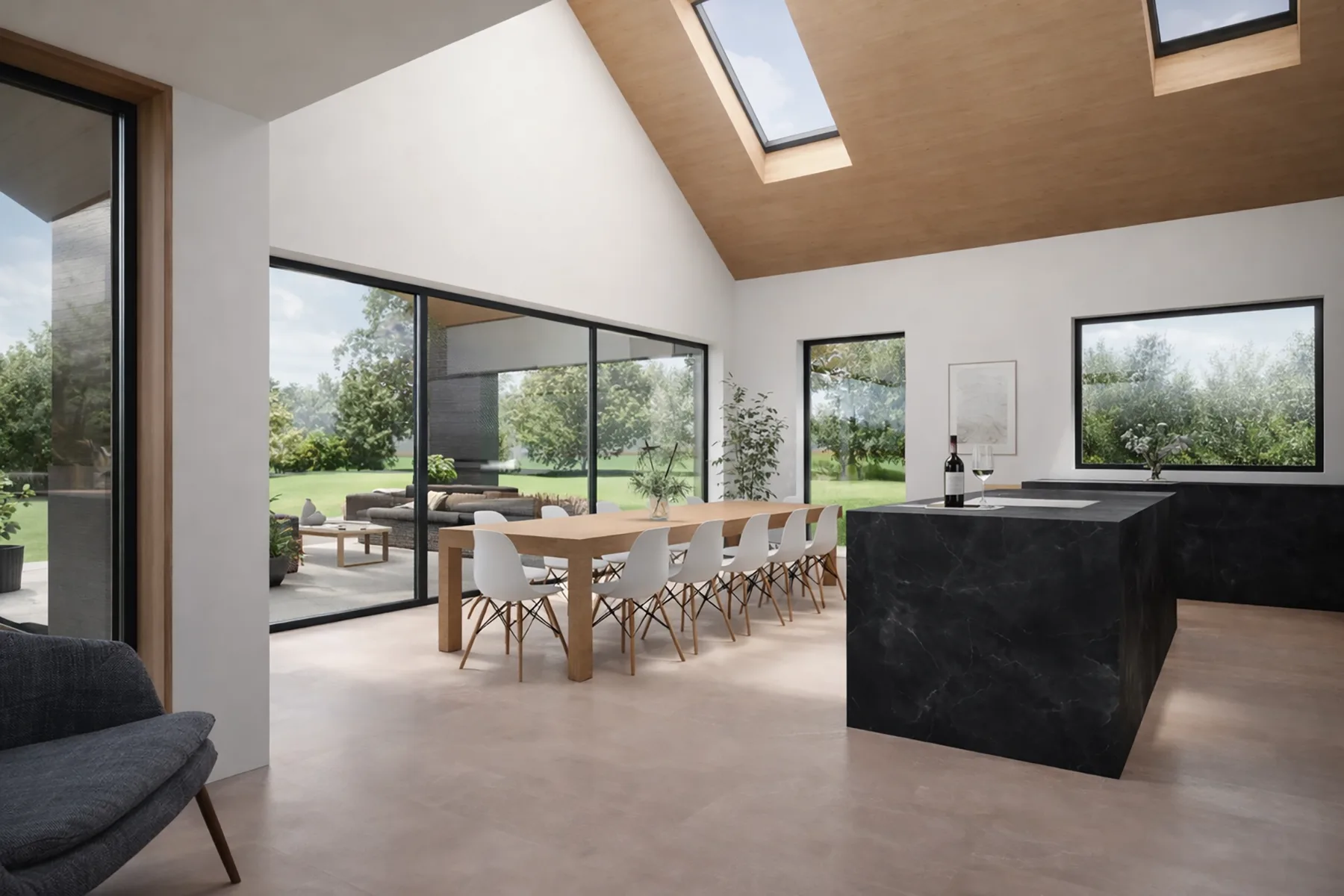 The design responds to the sloping site by stepping the building into the terrain, allowing the form to sit comfortably within its setting while maximising views and daylight. A series of simple, contemporary volumes are arranged to clearly separate living and sleeping accommodation, connected by glazed circulation spaces that frame views of the surrounding landscape.